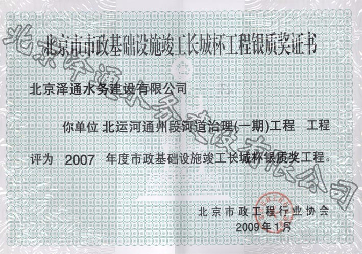 長城杯銀質獎證書